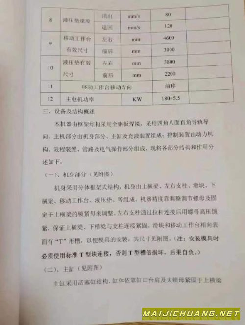 南通铭格2600吨框架油压机,有效台面3米4.6米,设备自重330吨,行程1.3米,开口2.5米,多点顶出移动台_ 信息编号:S126352 |